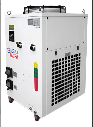 Chillers , Sistemas de enfriamiento o Enfriadores de agua enfriados por aire 6300 capacidad de enfriamiento 8.16 KW = 2.3203 Toneladas de refrigeración Compatible con el protocolo de comunicación Modbus-485 Los enfriadores de agua enfriados por aire GUERRA LASER 6300 son aplicados para enfriar el láser YAG, el tubo RF de metal, co2, co2 de metal, maquinaria CNC y el láser semiconductor. 70L/min
